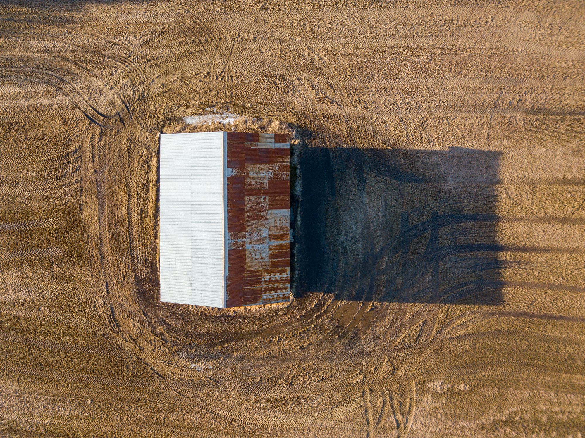Inte så intressant vid första ögonkastet, men det är lite lustigt om du tittar lite närmare och lite längre på bilden. Då ser du att den solbelysta takplåten är typ helt ny medan den i skuggan är gamma och rostig. Marken runtomkring är i stort sett bara hlulspår. Skuggan faller nästan helt korrekt mot ladan.