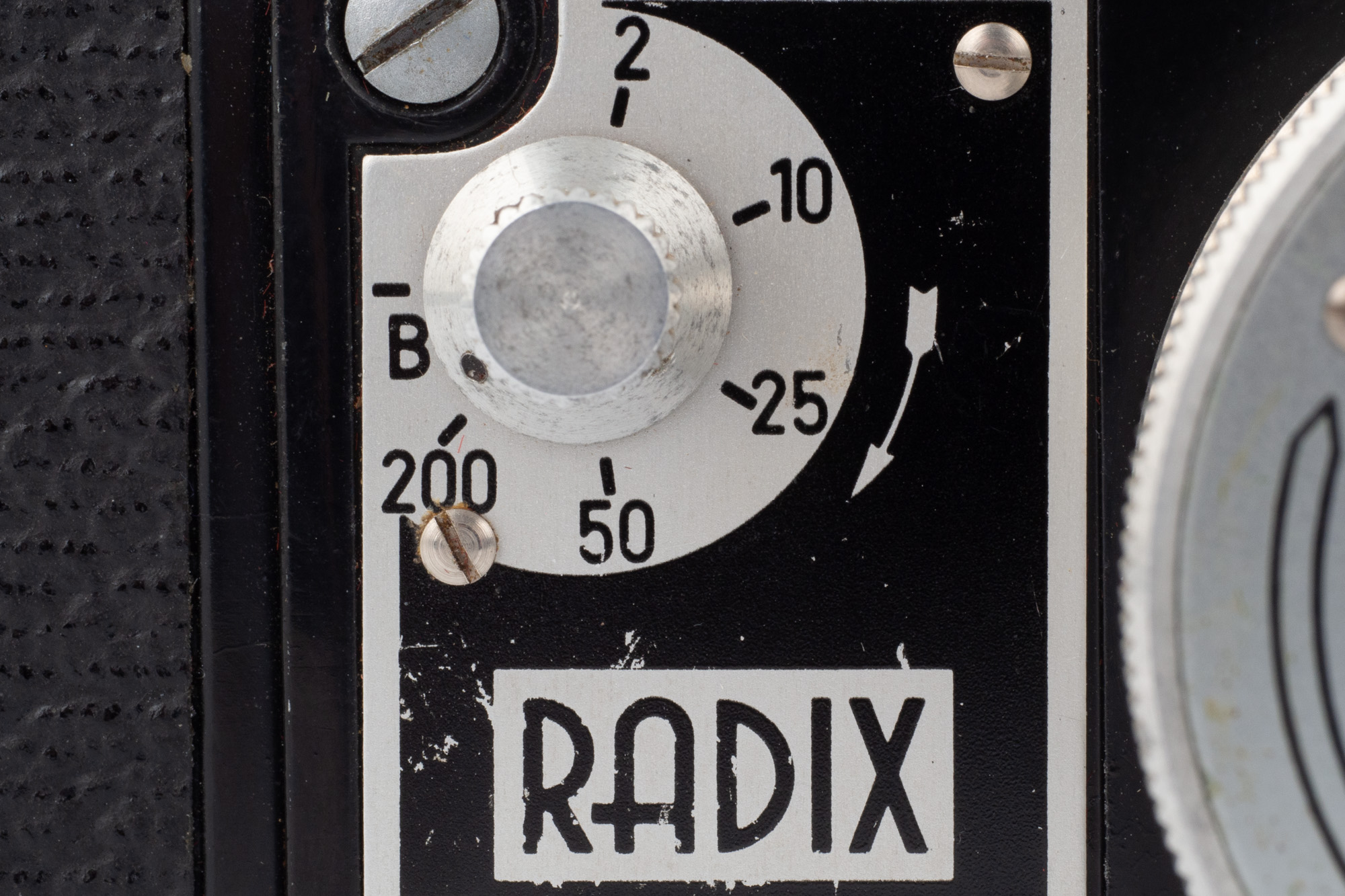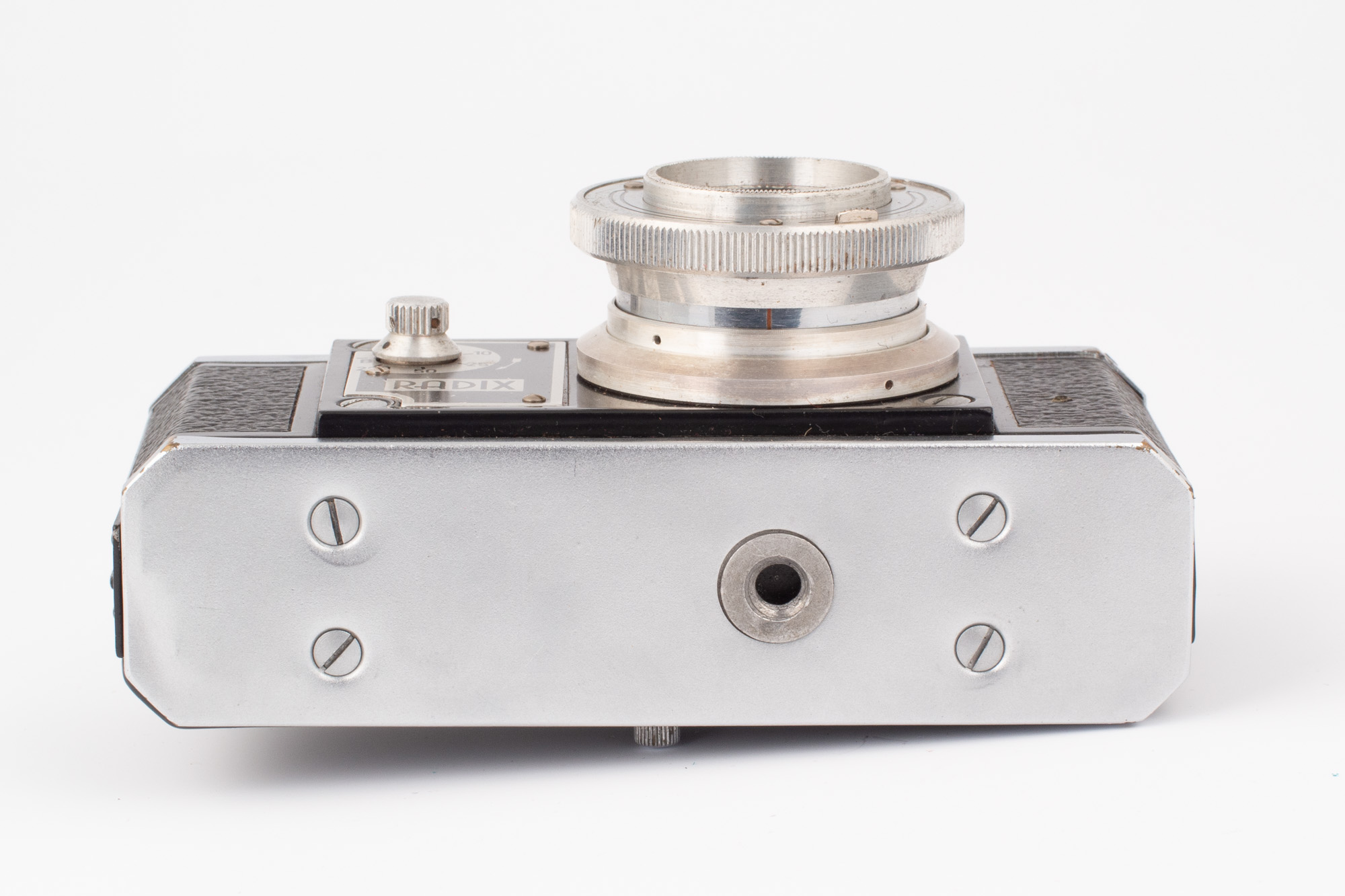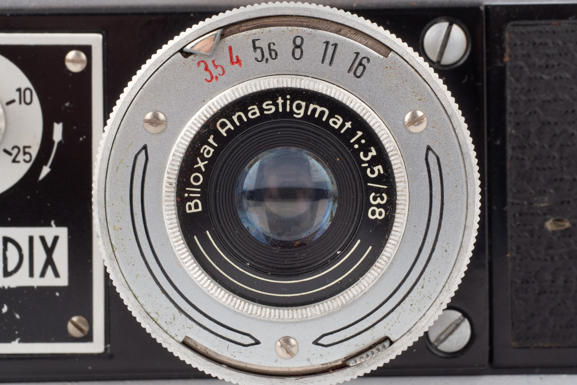 Radix finns i 13 versioner och vårt exemplar är troligen en Radix 35BH, även kallad Radix 5a, med tanke på den optik och den slutare som sitter monterad. Objektivet är ett Biloxar Anastgmat 38mm f/3,5. Slutaren klarar 1/200s - 1/2s + B.