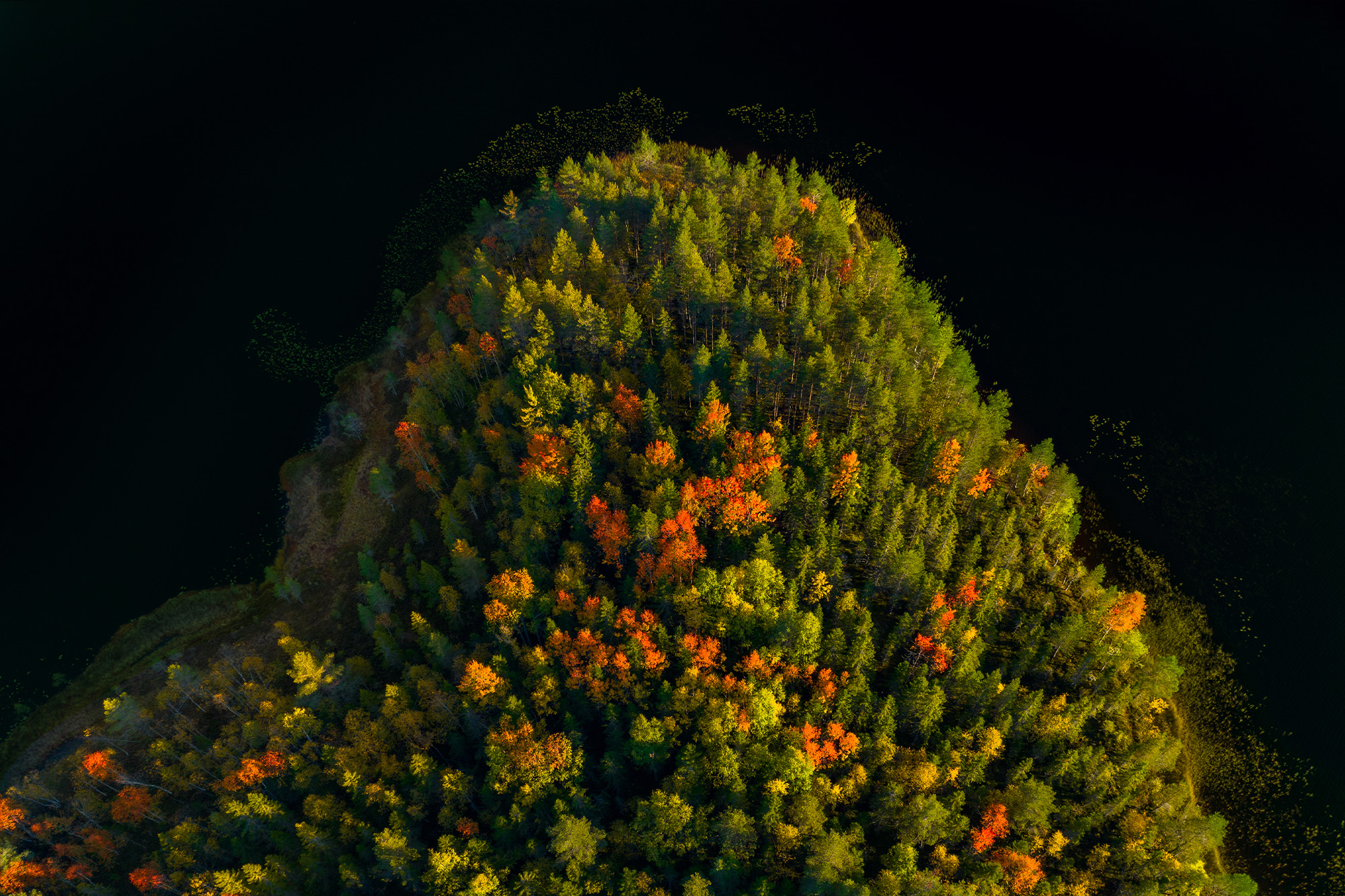 Det finns en liten sjö mitt ute i ingenstans som vi brukar besöka ibland och denna gång så lyste vackra gyllene lövträd bland mörkgröna barrträd. Självklart skulle drönaren fram!