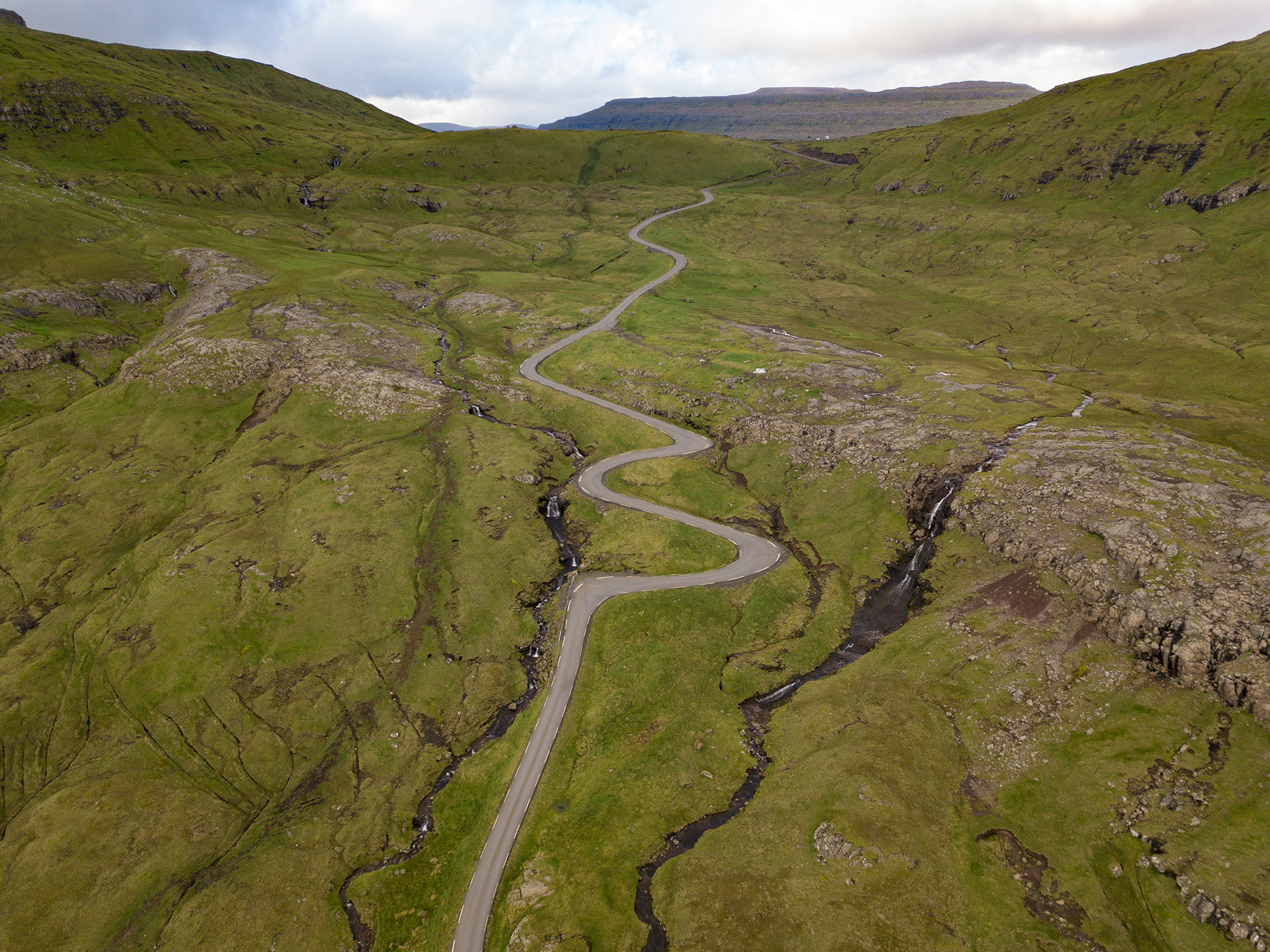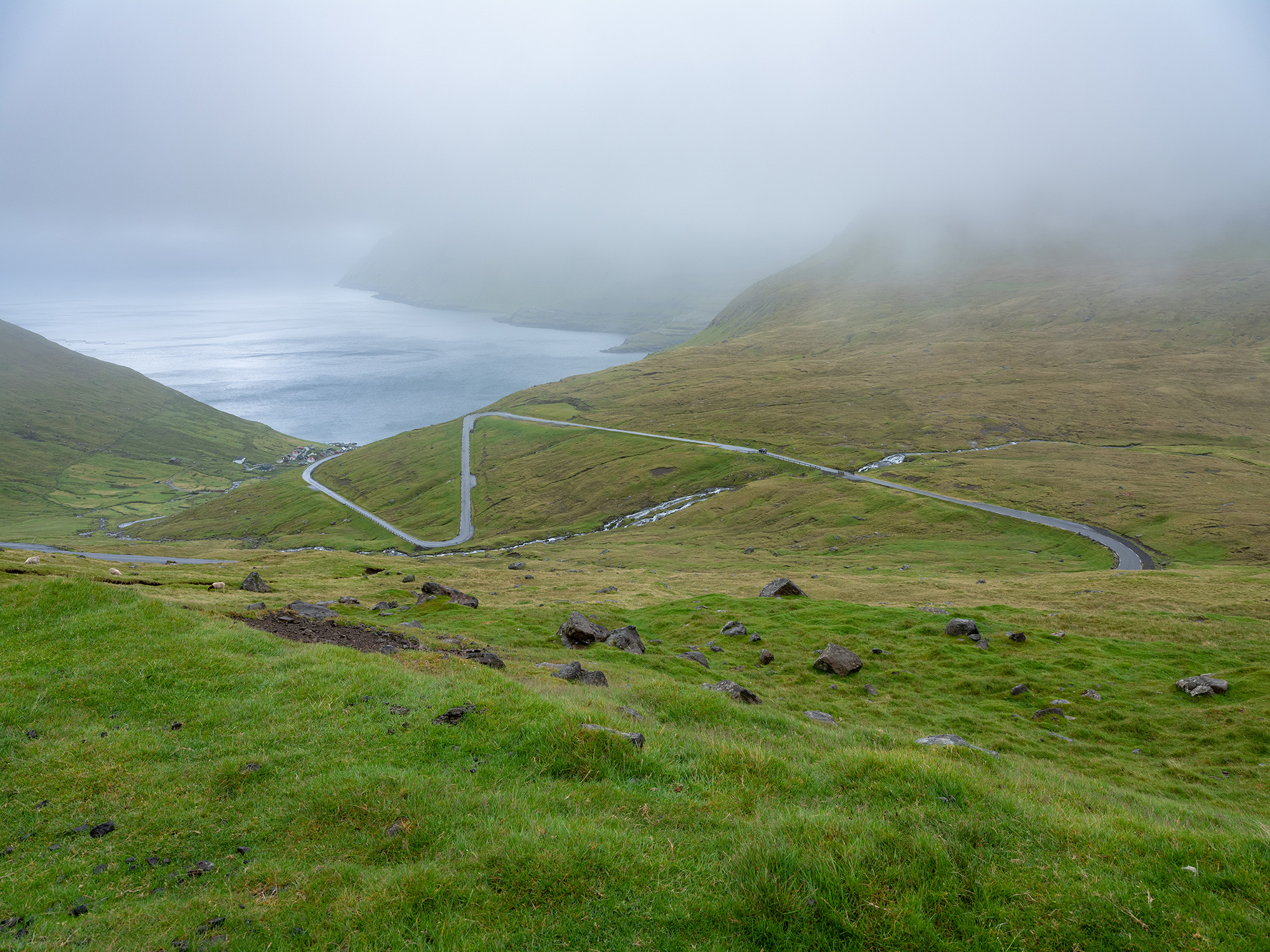 Ser du tunneln? Man kommer ut mitt i berget och tunneln är enfilig, många tunnlar är enfiliga och det kändes lite udda från början men det funkade rätt bra ändå. Ena hållet har företräde och andra hållet får köra in på en av de många mötesplatserna och sedan släcka sitt ljus. Kanske de gör så för att visa att de inte är i vägen och att inte störa de andra bilisterna. Dessa små tunnlar, även om de kan vara långa, saknar takbelysning. De större tunnlarna är tvåfiliga och har belysning. Den tunnel du ser på bilden är 1445m lång och förbinder Gásadalur med övriga Färöarna. Om man ville nå byn innan tunneln byggdes var man tvungen att gå den historiska vandringspromenaden över berget, ta trappan från stranden eller använda sig av helikopter för att nå byn. I och med tunnelbygget hoppas kommunen att invånarantalet i Gásadalur ska öka igen. Bilden är tagen med Fujifilm GFX50S + GF 32-64/4,0 R LM WR, 32mm, 1/125s, f/5,6 och ISO 125.