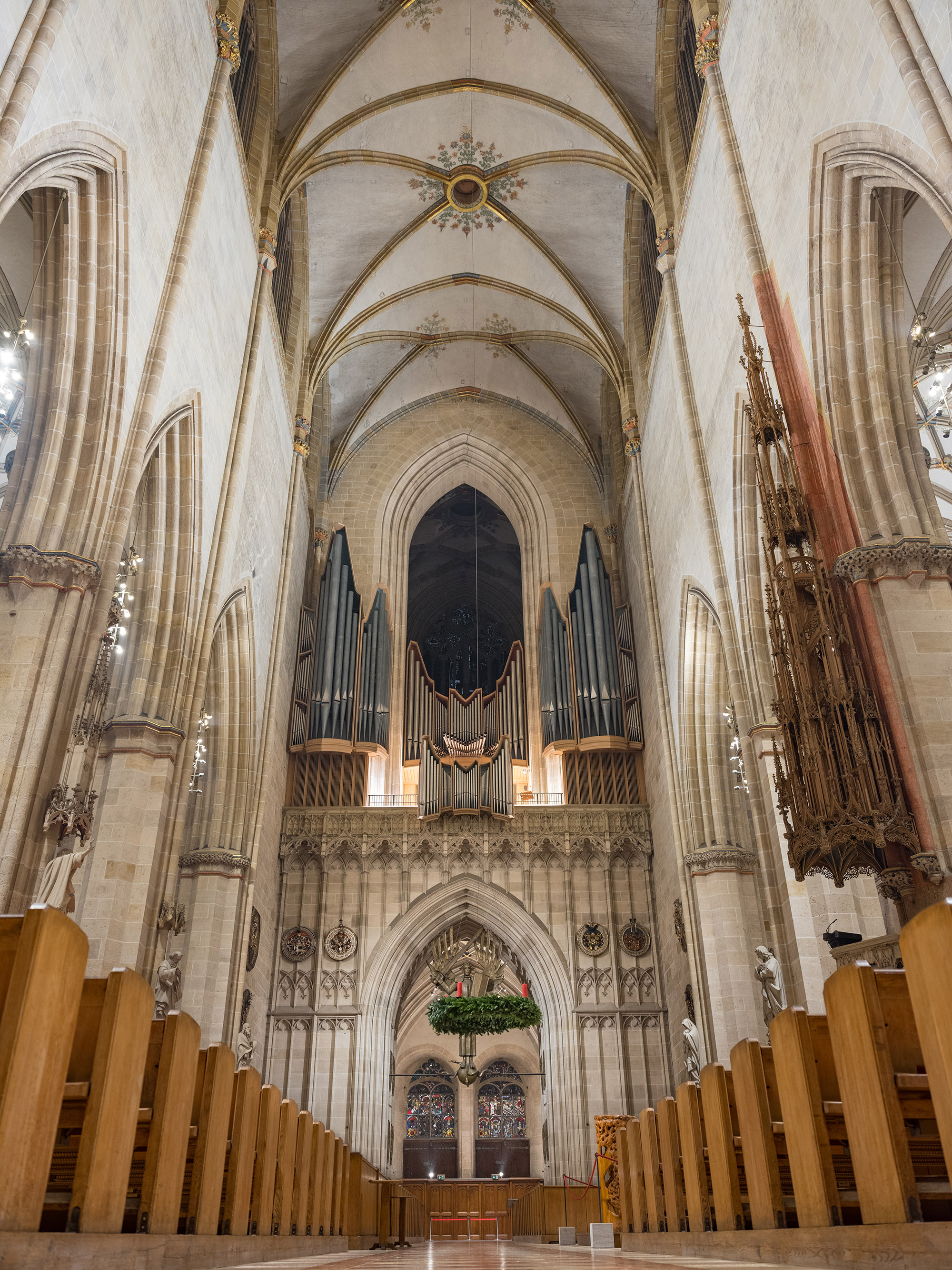 En bild inifrån Ulmer Münster, en kyrka i gotisk stil. Den har världens högsta kyrktorn på 161,53 meter. Den är också tysklands största lutherska kyrka.