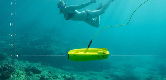En undervattensdrönare med fem motorer/propellrar för maximal kontroll och stabilitet. Den kan dyka ner till 100 meters djup och spela in film i 4K-kvalitet. Du kan låsa den på ett visst djup och tilta den upp/ner +/- 45 grader. Följ dess resa live på din mobil eller surfplatta.