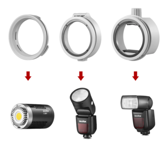 Den runda adaptern är tillämplig på alla Godox-blixtar med runda huvuden, såsom V1-blixtar, AD100PRO-fickor och AD200PEO-blixtar med runda huvuden