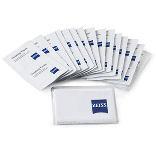 Zeiss rengöringservetter och microfiberduk En 20-pack med rengöringservetter, samt en putsduk i microfiber med Zeiss-logotyp.