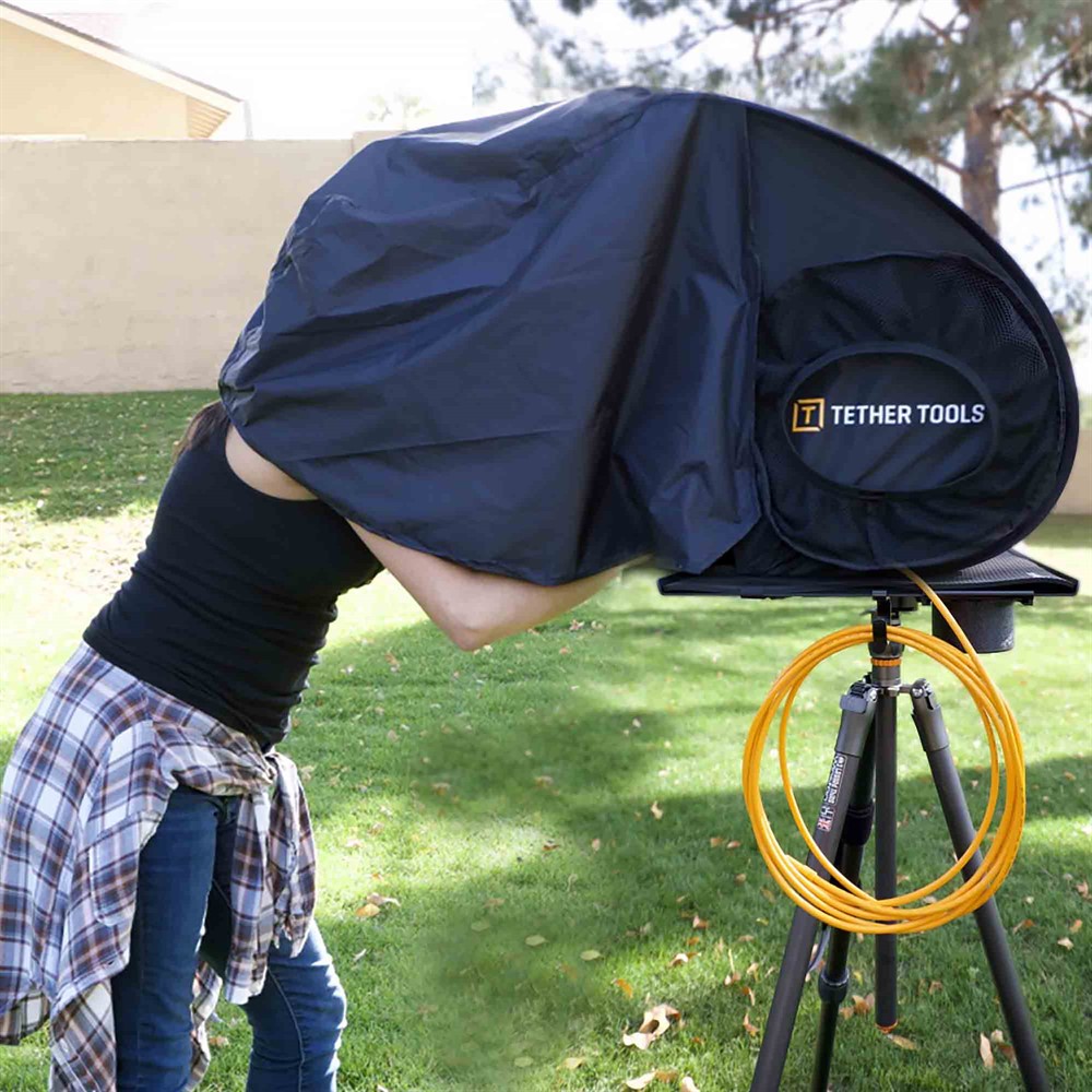 Fota med kameran kopplad till din dator även när du är utomhus när det är soligt. Minska bländningen när du fotar ute och gör det enkelt och tydligt att se dina foton på plats med Aero solskydd från Tether Tools.