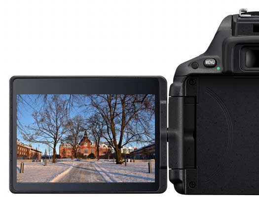 Vridbar skärm blir allt vanligare bland systemkameror. Att den är vridbar har sina fördelar, speciellt i kombination med Live View och videofilmning. Vilket gör att man kan fotografera och filma i alla möjliga och omöjliga vinklar. Om man dessutom viker skärmen inåt mot kamerakroppen så är den skyddad vid t ex transport eller vid fotograferande i sämre förhållanden. Har man en gång vant sig vid vikbar skärm så kan det kännas svårt att vara utan. Skärmen har bred betraktningsvinkel, är på 3,2 tum och har 1.037.000p, en mycket bra skärm med andra ord. Skärmen har också touch-funktion, som innebär att man kan peka på skärmbilden på den punkt man vill sätta fokus och kameran fokuserar automatisk på samma punkt och tar en bild direkt, väldigt smidigt. Man kan även välja att kameran bara ska fokusera utan att ta en bild, och numera finns möjligheten att bläddra och förstora/förminska bilderna precis som på en smartphone. Även menyerna touchkänsliga. Pek-kontrollen går självklart att avaktivera för den som inte vill använda sig av den. Den optiska sökaren visar 95% av bilden med 0,82x förstoring, och i menyn kan man välja visning av rutnät. Mycket bra skärm och godkänd sökare.
