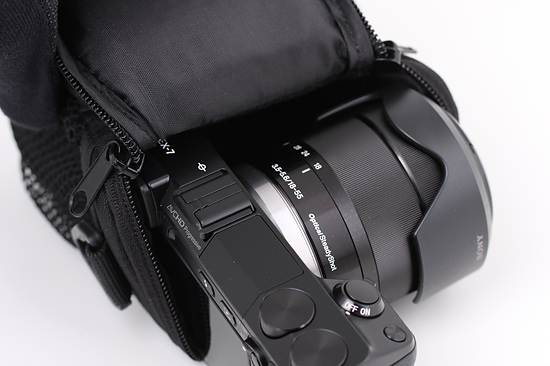 Bilden nedan visar väskan med NEX 7 (föregångare till A6000) + 18-55 med lock och motljusskydd.