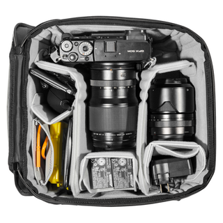FlexFold-avdelare möjliggör anpassningsbar organisering och skydd. Stapla föremål vertikalt för maximal kapacitet. Flytande ficka för objektivlock, filter och andra småsaker.