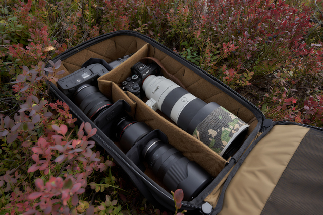 Två kamerahus och minst 5-10 objektiv (beroende på objektivstorlek) får plats ifall man väljer att använda hela utrymmet till kamerautrustningen. Ryggsäcken levereras dock avdelad med ett fotofack nedtill och tilltänkt klädfack upptill. Här har jag möblerat om lite för att i första hand få plats med 200-600mm-telezoomen inkl motljusskydd och monterad kamera. Jag packade ryggsäcken full med strax över 12 kg inkl all utrustning, och det var inget större problem att bära omkring i oländig skogsterräng tack vare de breda axelremmarna och midjebältet. Ryggsäcken kändes välbalanserad.