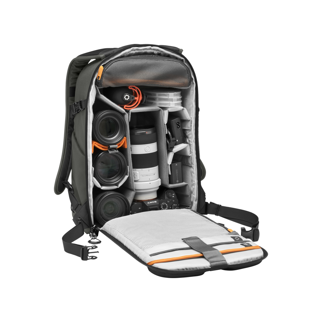 Insidan erbjuder en ny avdelningslayout och förbättrad möjlighet för mångsidig förvaring för spegelfria kamerautrustningar och/eller andra utrustningar (drönare t ex) tillsammans med resestativ, 10 ”surfplatta, 13” bärbar dator och mer. Förbättrade 10 mm YKK-blixtlås ger en mjukare funktion medan främre gjutna EVA-stötfångare ger ökad säkerhet för värdefull utrustning när väskan sätts ner. Främre tillbehörsfack och avtagbar, vadderad tillbehörsväska ingår.