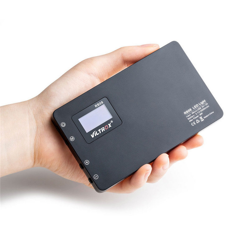 Viltrox RB08 har ett inbyggt batteri på 3000 mAh, en batteritid på upp till 1,2 timme och laddning via micro-USB. Belysningen har ett 1/4-tumsfäste på botten vilket gör att den kan monteras till flertalet olika stativ och andra tillbehör. Den kan även med fördel monteras direkt i blixtskon på kameran tack vare den medföljande 1/4-tums till blixtskoadaptern.