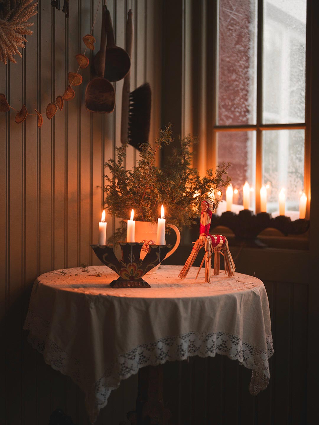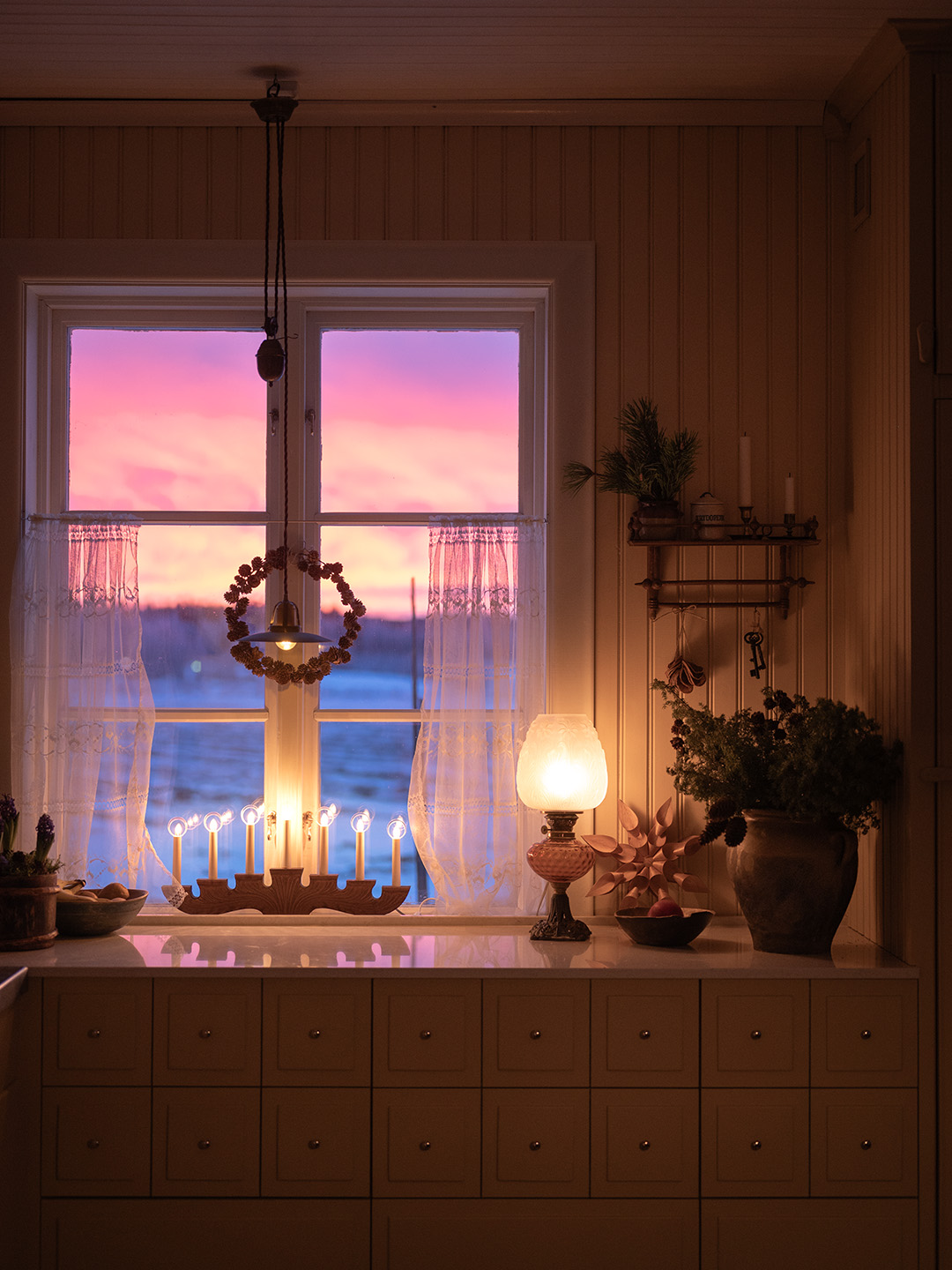 I år vill jag försöka fånga det där mötet mellan värme och kyla, mellan ute och inne. Det kalla blå eller svagt rosa ljuset i gryning och skymning mot den mjuka värmen från ett rum där elden brinner eller kaffet ångar.