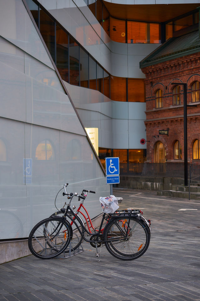 Brännvidd 50mm, bländare f/2,8 med fokus på den svarta cykeln.