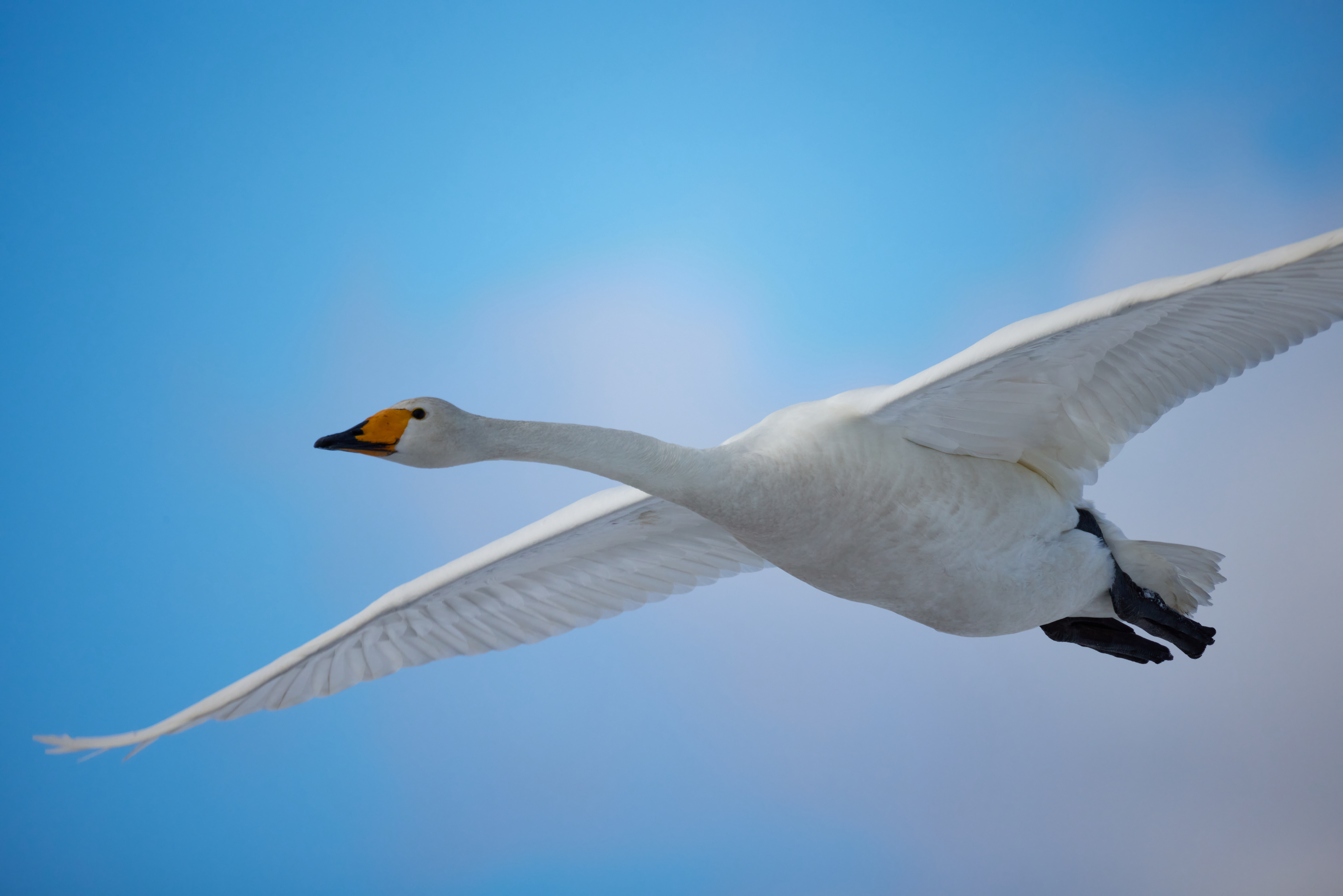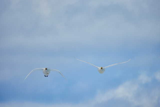 Fokus på svanarna i bakgrunden som är på väg in för landning.