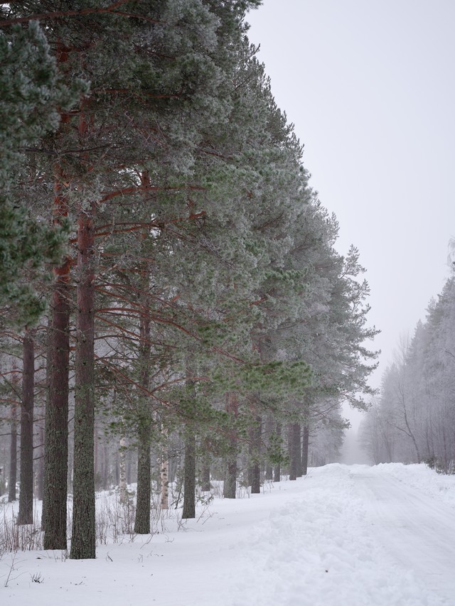 Bländare f/5,6. Tiltad sidledes för skärpa på tallarna längs vägkanten, och shiftad uppåt för komposition och raka linjer.