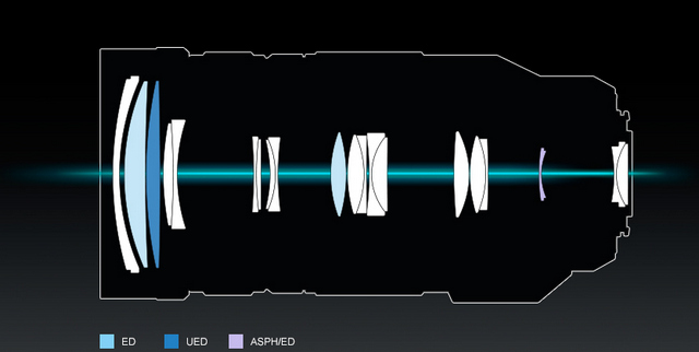 Linser klassade som Extra-Low Dispersion (ED) och Ultra Extra-Low Dispersion (UED) korrigerar kromatisk aberration och ger skarpa, kontrastrika bilder med klara färger ända ut i hörnen.