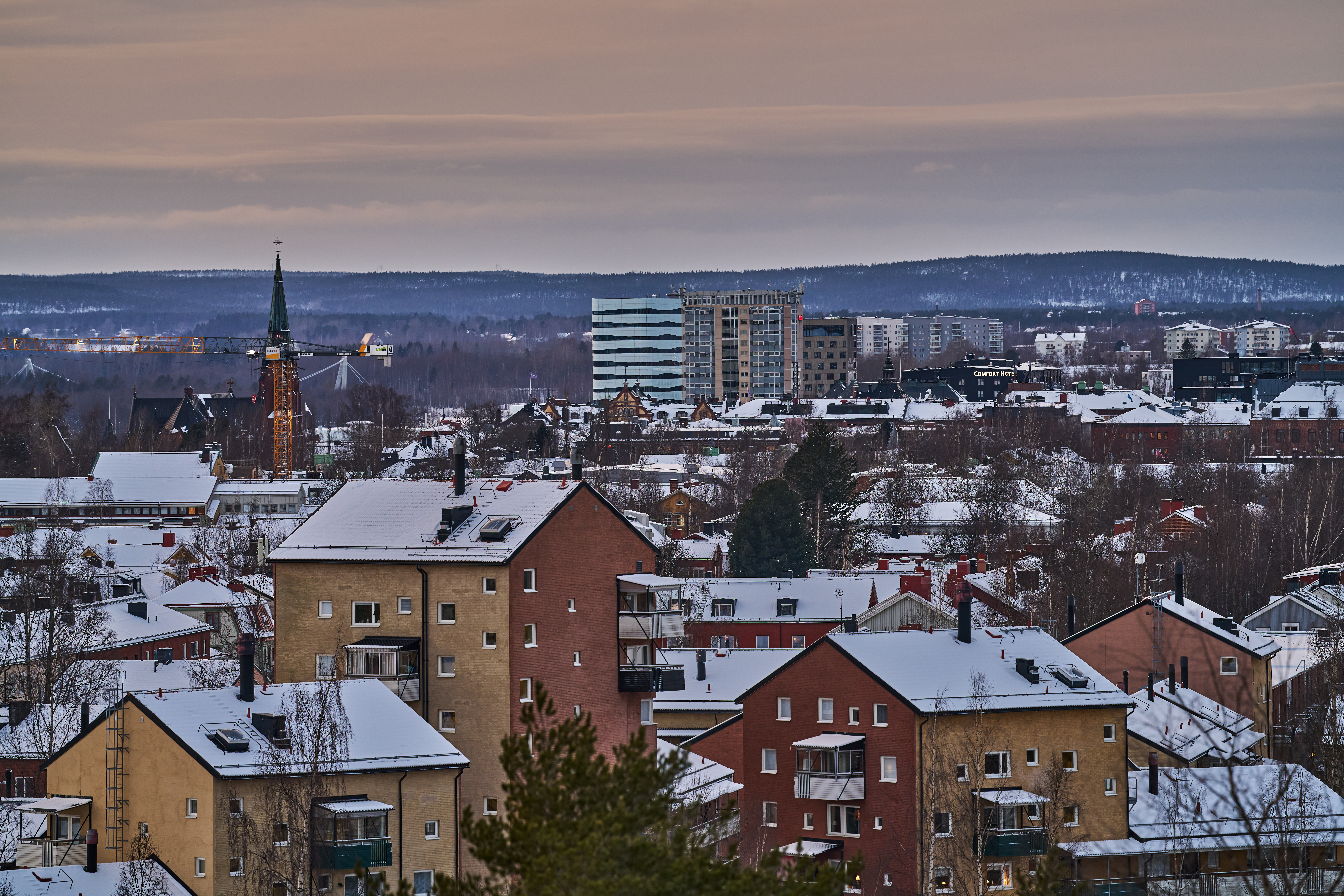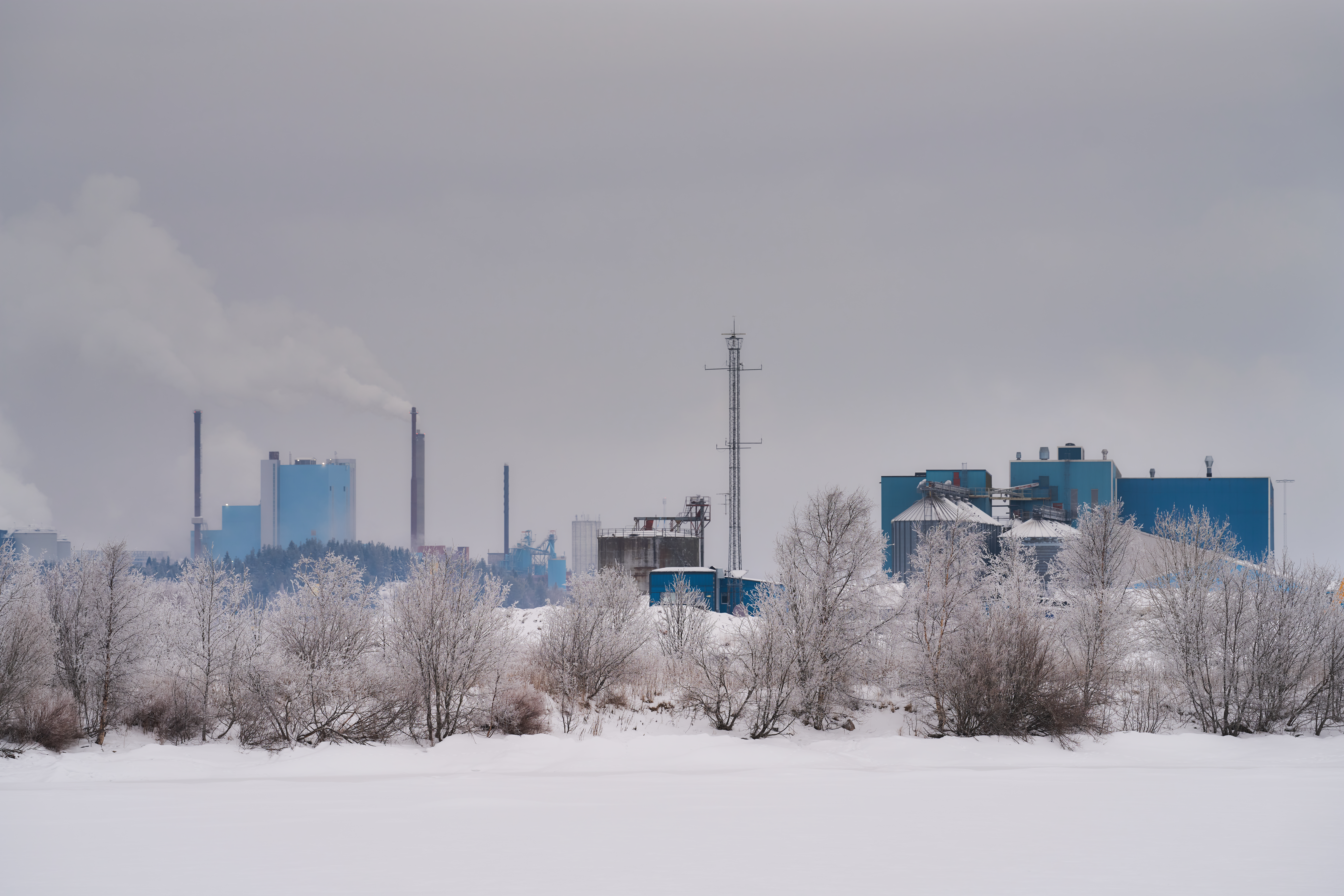 Bländare f/5,6. Fokuserad på buskarna i förgrunden och avståndet mellan kameran och fabriken i Obbola till vänster i bild, är över 3 km fågelvägen.
