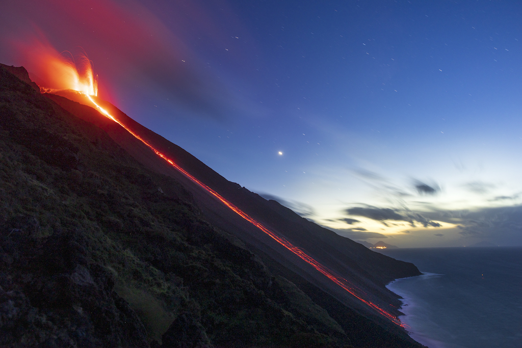 Vandringen har gett oss många fina fotomöjligheter men det är nu när vi står på berget under den klara natthimmeln som resans fotografiska höjdpunkt väntar. Vi befinner oss på den vulkaniska ön Stromobli och får nu uppleva och fotografera den storslagna naturupplevelsen när vulkanen får utbrott och sprutar ut lava framför våra ögon.