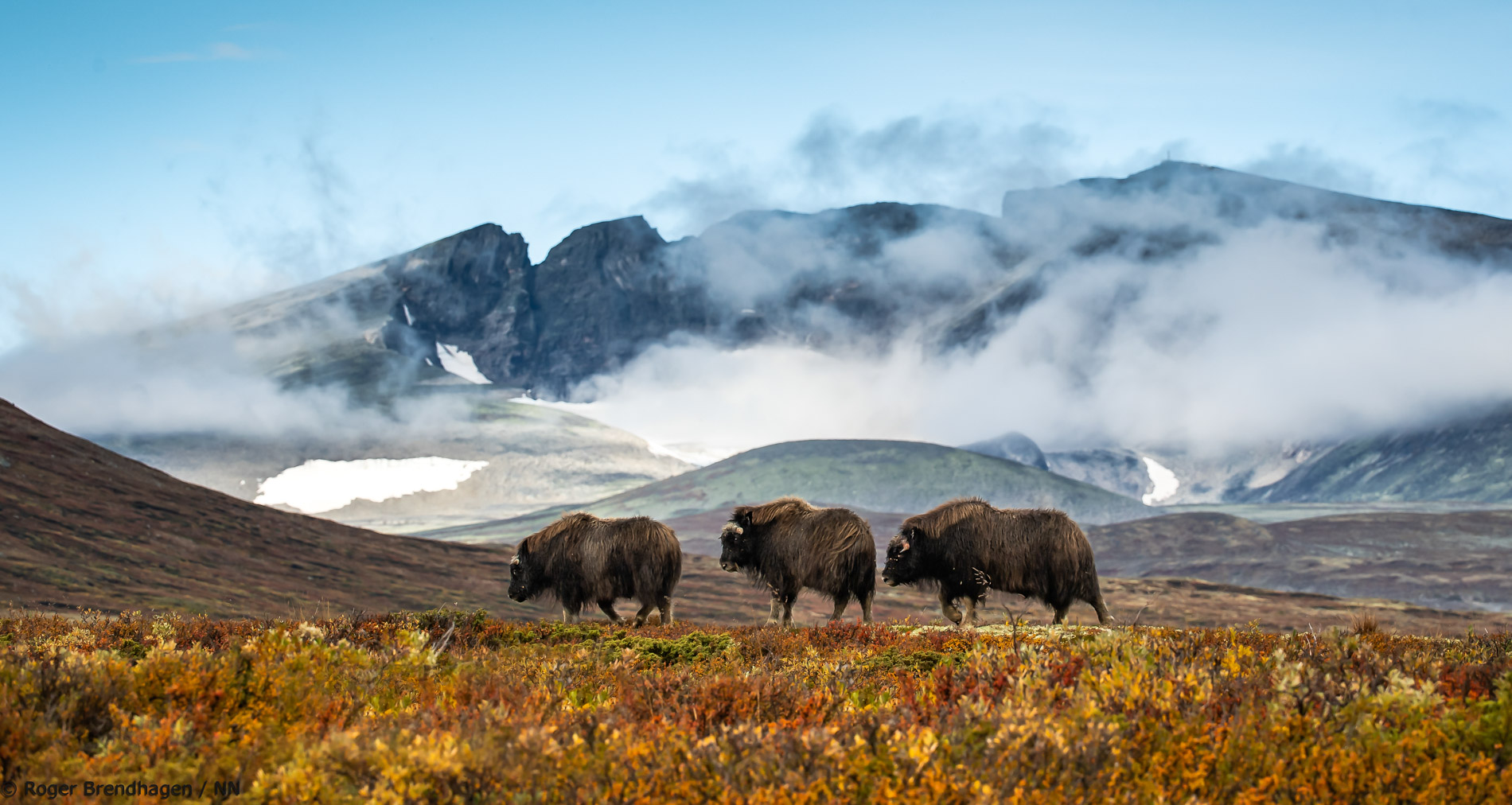 När de mäktiga myskoxarna sakta vandrar över det kuperade landskapet känns det som att förflytta sig tillbaka till en svunnen tid. Att se myskoxarna med sina märkliga horn, tjocka päls och med de dramatiska bergen i bakgrunden är detta en storslagen fotoupplevelse.